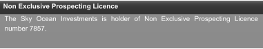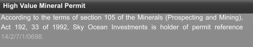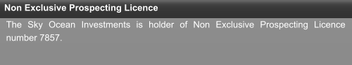 Company Information Company Scope Non Exclusive Prospecting Licence High Value Mineral Permit Registration The Sky Ocean Investments CC is a namibian company registrated at Ministry of Finances and Ministry of Trading with the number CC/2015/04351. Establishment  28th of April of 2015  Company Location  Windhoek - Namibia  Key Executives  José Rodrigues - Managing Director   Business Scope   Trading Precious and Semi-Precious Minerals Prospecting and mining Precious and Semi-Precious Minerals Selecting and inspecting Precious and Semi-Precious Minerals  Gemmological Advise Mining Advise  Major Services Range  Gemmological Advise and Inspection  EPL (Exclusive Prospecting Licence) Advise   Collecting and Analyze of geological samples  Mining Advise  Gemstones Trading  Mining Business Plan Develop  According to the terms of section 105 of the Minerals (Prospecting and Mining), Act 192, 33 of 1992, Sky Ocean Investments is holder of permit reference 14/2/7/1/0698.  The Sky Ocean Investments is holder of Non Exclusive Prospecting Licence number 7857.