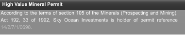 Company Information Company Scope Non Exclusive Prospecting Licence High Value Mineral Permit Registration The Sky Ocean Investments CC is a namibian company registrated at Ministry of Finances and Ministry of Trading with the number CC/2015/04351. Establishment  28th of April of 2015  Company Location  Windhoek - Namibia  Key Executives  José Rodrigues - Managing Director   Business Scope   Trading Precious and Semi-Precious Minerals Prospecting and mining Precious and Semi-Precious Minerals Selecting and inspecting Precious and Semi-Precious Minerals  Gemmological Advise Mining Advise  Major Services Range  Gemmological Advise and Inspection  EPL (Exclusive Prospecting Licence) Advise   Collecting and Analyze of geological samples  Mining Advise  Gemstones Trading  Mining Business Plan Develop  According to the terms of section 105 of the Minerals (Prospecting and Mining), Act 192, 33 of 1992, Sky Ocean Investments is holder of permit reference 14/2/7/1/0698.  The Sky Ocean Investments is holder of Non Exclusive Prospecting Licence number 7857.